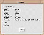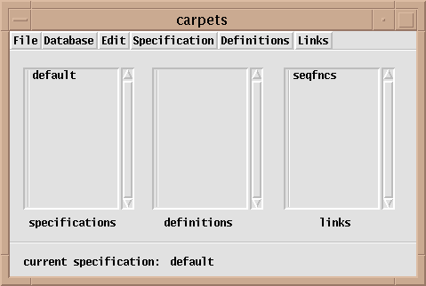 The database initialially contains a single default specification. There is always a current carpet specification, initially the default one. The database can be changed by adding and deleting specifications, as well as by loading an existing database from a file. There is no limit to the number of specifications that can be contained in a database except the amount of memory available.