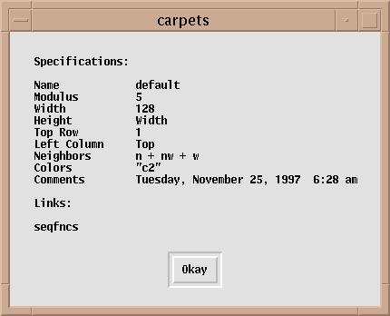 modulus @M edit modulus expression width @W edit width expression height @H edit height expression top @T edit top-row initializer expression left @L edit left-column initializer expression neighbors @N edit neighborhood expression color @C edit color-list expression name @I edit name (identification) comments @K edit commentsThe Specification menu provides items relating to individual specifications: