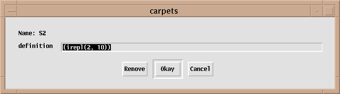 The definitions list shows the defined names for the definitions in the current carpet specification. Clicking on one brings up a dialog that allows you to edit or delete the definition. (Definitions are added via the Definitions menu (