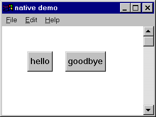 WinButton(W, "hello", x, y, wd, ht)This function places a button with a particular size and position. The size defaults to a standard size large enough display the button's label. The appearance of a pair of buttons is illustrated in Figure 8. When a button is pressed, the button's string label is produced (in this case,