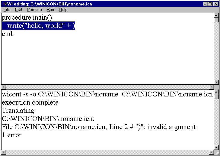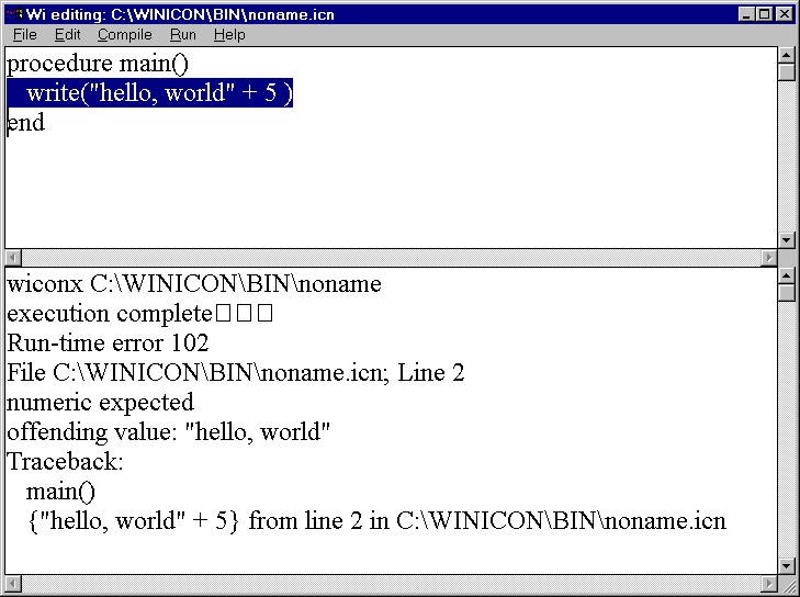 highlighted. The message for a run-time error includes Icon's standard