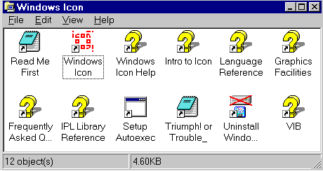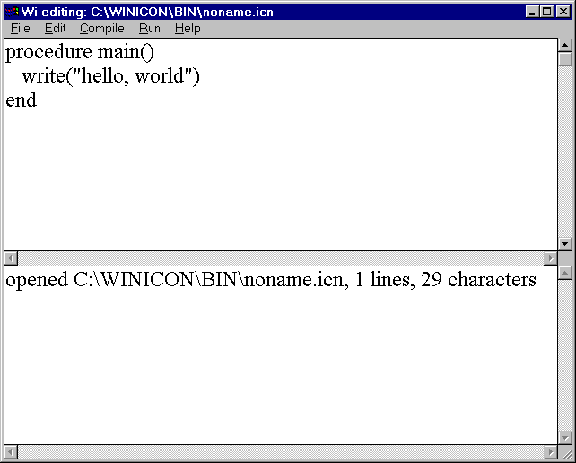 Windows Icon also includes a compiler (wicont) and virtual-machine interpreter (wiconx) that do support graphics facilities and do run on Windows 3.1; while these tools can be invoked from the command-line under Windows95 and NT, they are usually invoked by Wi. The instructions below refer to nticont and nticonx, but generally would also be true for wicont and wiconx. The Windows icode files that result of compilation have the extension .bat, for example, the above compilation would produce a file prog.bat. Under Windows NT or Windows95 this file can be run by