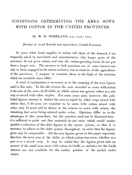 Conditions Determining the Area Sown with Cotton in the United Provinces [India], Moreland, W. H. The Agricultural Journal of India, Vol. 1 (January 1906), 7 pages. CD (HWDA11). Posted November 5, 2004. SAMPLE PAGE. File size 444 KB PDF