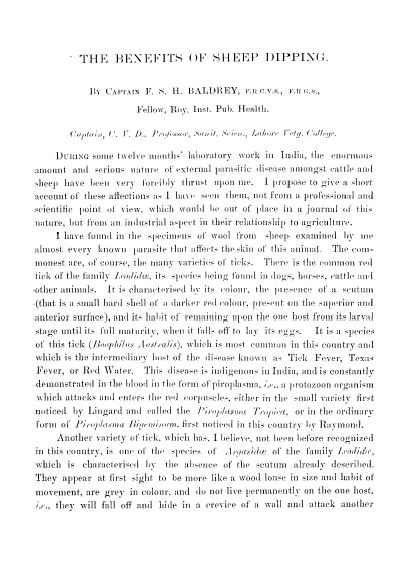 Benefits of Sheep Dipping, Baldrey, F. S. H. The Agricultural Journal of India, Vol. 1 (October 1906), 4 pages. CD (HWDA11). Posted November 7, 2004. SAMPLE PAGE. File size 600 KB PDF