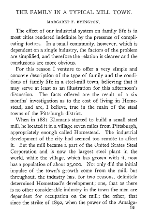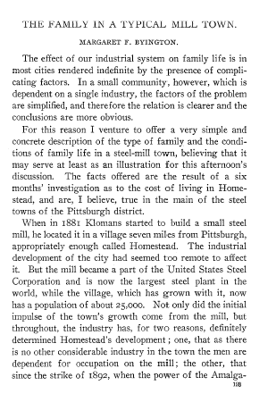 Family in a Typical Mill Town, Byington, Margaret F. American Economic Association, Vol. 10 No. 1 (1909), 14 pages. CD (HWDA10). Posted June 20, 2004. SAMPLE PAGE. File size 936 KB PDF