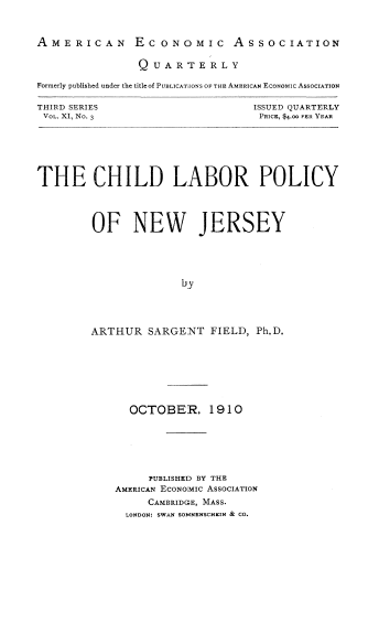 Child Labor Policy of New Jersey, Field, Arthur Sargent. American Economic Association, Vol. 11, No. 3 (October 1910), 231 pages. CD (HWDA07). Posted January 3, 2004. SAMPLE PAGE. Part 1: File size 6.3 MB PDF. Part 2: File size 6.3 MB PDF.