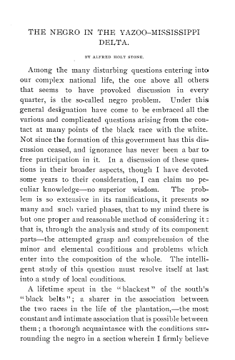 Negro in the Yazoo-Missippi Delta, Stone, Alfred Holt. American Economic Association, Vol. 3, No. 1 (February 1902), 38 pages. CD (HWDA07). Posted December 14, 2003. SAMPLE PAGE. File size 2.3 MB PDF
