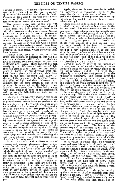 Textiles or Textile Fabrics, Sturgis, Russell. The Americana, 1903, 3 pages. Posted August 9, 2003. SAMPLE PAGE. File size 412 KB PDF