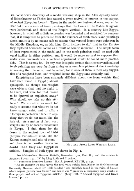 Loom Weights in Egypt, Mace, A. C. Ancient Egypt, 1922, 3 pages. CD (HWDA11). Posted September 24, 2004. SAMPLE PAGE. File size 752 KB PDF