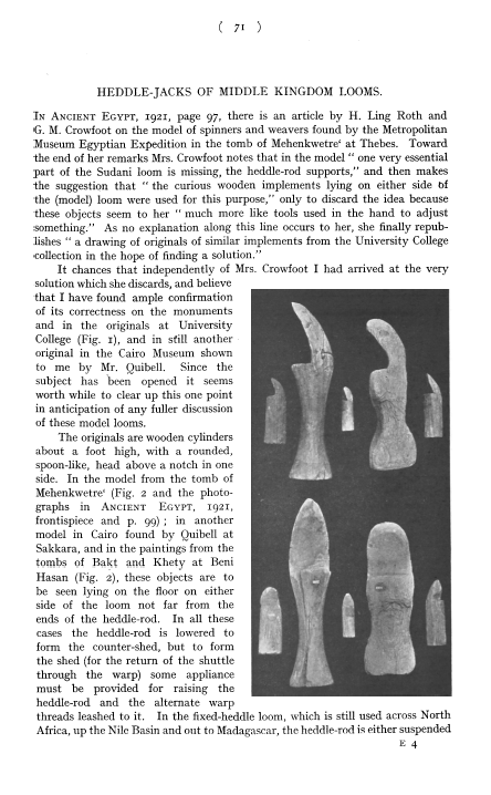 Heddle-Jacks of Middle Kingdom Looms, Mace, A. C. Ancient Egypt, 1922, 4 pages. CD (HWDA11). Posted September 24, 2004. SAMPLE PAGE. File size 808 KB PDF