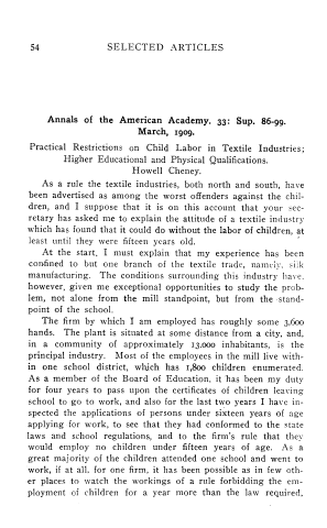 Practical Restrictions on Child Labor in Textile Industries; Higher Educational and Physical Qualifications, Cheney, Howell. Annals of the American Academy, 1909, 15 pages. Note: From "Selected Articles on Child Labor", Debater's Handbook Series, 1911. CD (HWDA07). Posted October 22, 2003. SAMPLE PAGE. File size 1 MB PDF