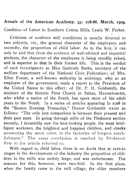 Conditions of Labor in Southern Textile Mills, Parker, Lewis W. Annals of the American Academy, 1909, 5 pages. Note: From "Selected Articles on Child Labor", Debater's Handbook Series, 1911. CD (HWDA07). Posted October 22, 2003. SAMPLE PAGE. File size 572 KB PDF