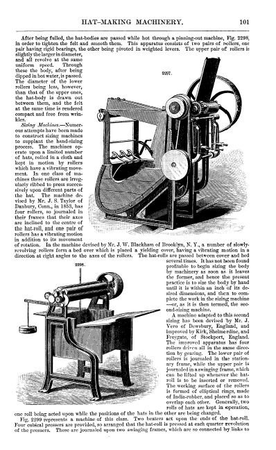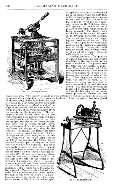 Hat-Making Machinery, ---. Appletons' Cyclopaedia of Applied Mechanics, 1889, 12 pages. Posted March 14, 2004. SAMPLE PAGE. File size 2 MB PDF