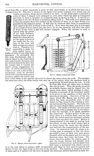 Harvester, Cotton, ---. Appletons' Cyclopaedia of Applied Mechanics, 1889, 3 pages. Posted March 5, 2004. SAMPLE PAGE. File size 636 KB PDF
