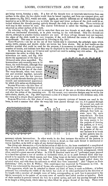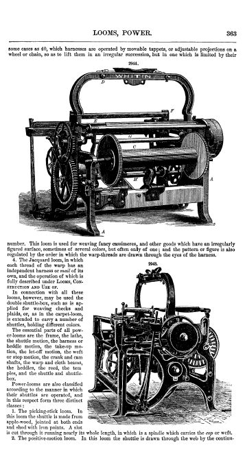 Looms, Construction and Use Of, [Barlow, Alfred]. Appletons' Cyclopaedia of Applied Mechanics, 1889, 12 pages. Posted February 11, 2003. SAMPLE PAGE. File size 2 MB PDF