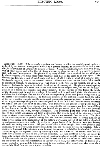Electric Loom, ---. Appletons' Cyclopaedia of Applied Mechanics, 1889, 1 page. Posted February 14, 2003. SAMPLE PAGE. File size 456 KB PDF