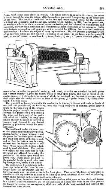 Cotton-Gin, ---. Appletons' Cyclopaedia of Applied Mechanics, 1889, 4 pages. Posted February 13, 2003. SAMPLE PAGE. File size 772 KB PDF