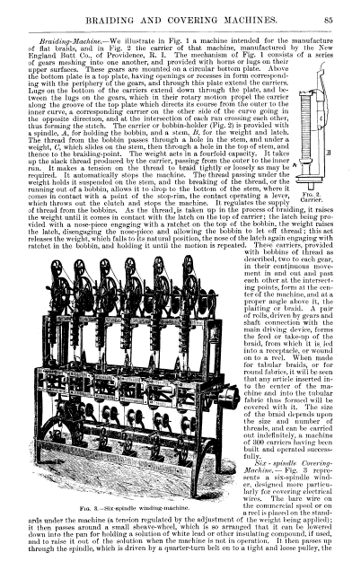 Braiding and Covering Machines, ---. Appletons' Cyclopaedia of Applied Mechanics, Supplement, 1897, 3 pages. Posted March 5, 2004. SAMPLE PAGE. File size 640 KB PDF