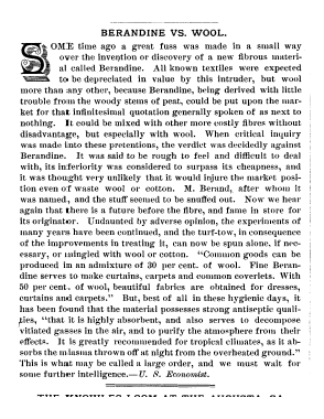 Berandine vs. Wool, ---. Baldwin's Textile Designer, Vol. 2, No. 1 (January 1889), 1 page. CD (HWDA09). Posted January 25, 2004. SAMPLE PAGE. File size 432 KB PDF