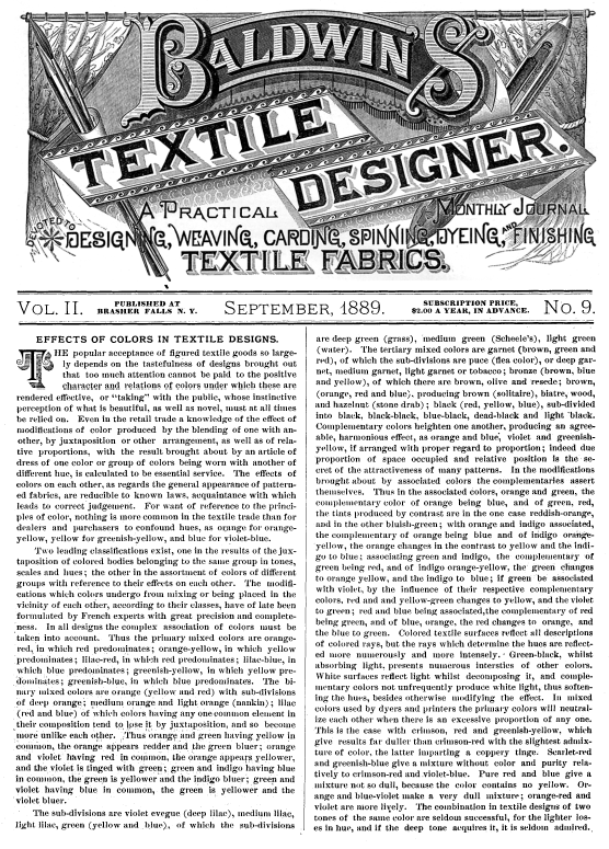 Effects of Colors in Textile Designs, ---. Baldwin's Textile Designer, Vol. 2, No. 9 (September 1889), 2 pages. CD (HWDA09). Posted January 25, 2004. SAMPLE PAGE. File size 716 KB PDF