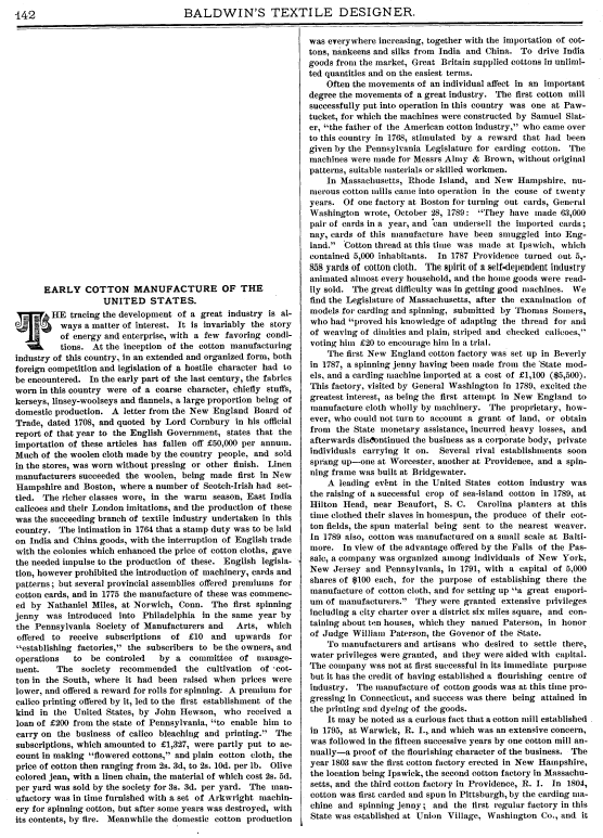 Early Cotton Manufacture of the United States, ---. Baldwin's Textile Designer, Vol. 2, No. 9 (September 1889), 2 pages. CD (HWDA09). Posted January 25, 2004. SAMPLE PAGE. File size 612 KB PDF