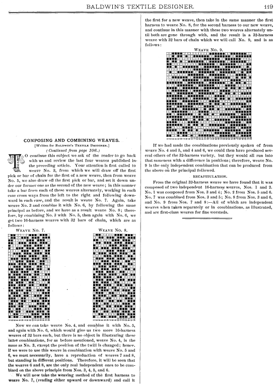 Composing and Combining Weaves, ---. Baldwin's Textile Designer, Vol. 1, No. 9 (September 1888), 1 page. CD (HWDA09). Posted September 20, 2003. SAMPLE PAGE. File size 492 KB PDF