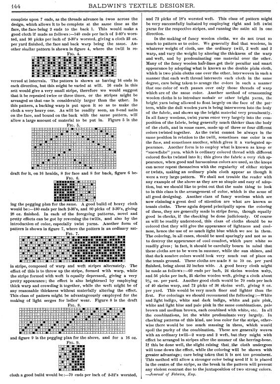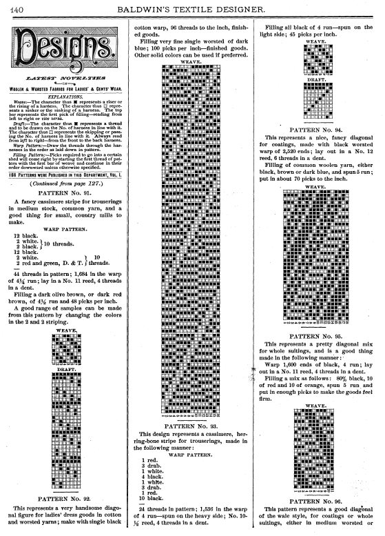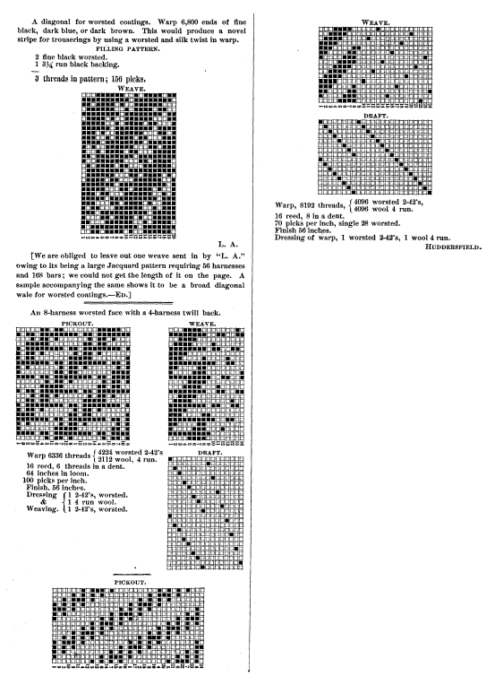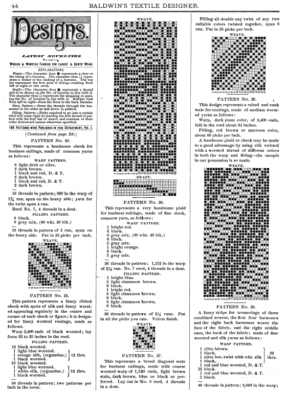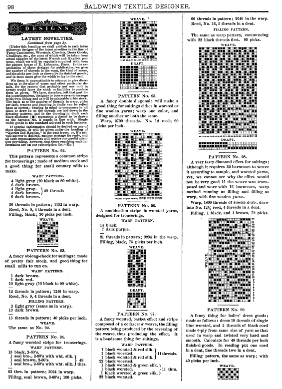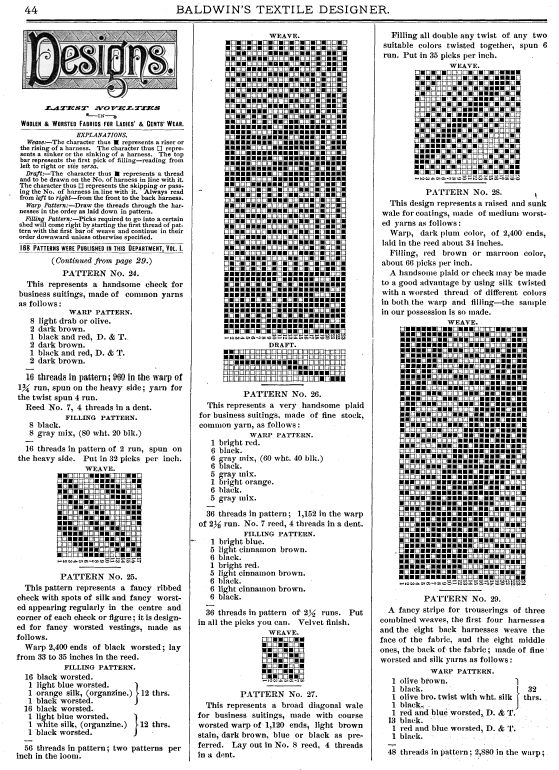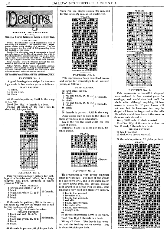 Worsteds and Woolens, Etc., ---. Baldwin's Textile Designer, Vol. 2, No. 9 (September 1889), 2 pages. CD (HWDA09). Posted January 25, 2004. SAMPLE PAGE. File size 672 KB PDF