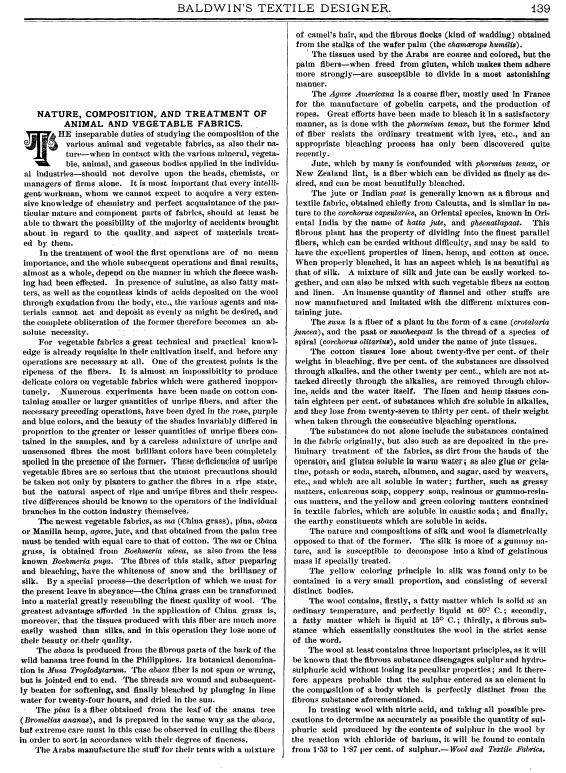 Nature, Composition, and Treatment of Animal and Vegetable Fibers, ---. Baldwin's Textile Designer, Vol. 2, No. 9 (September 1889), 1 page. CD (HWDA09). Posted January 25, 2004. SAMPLE PAGE. File size 560 KB PDF