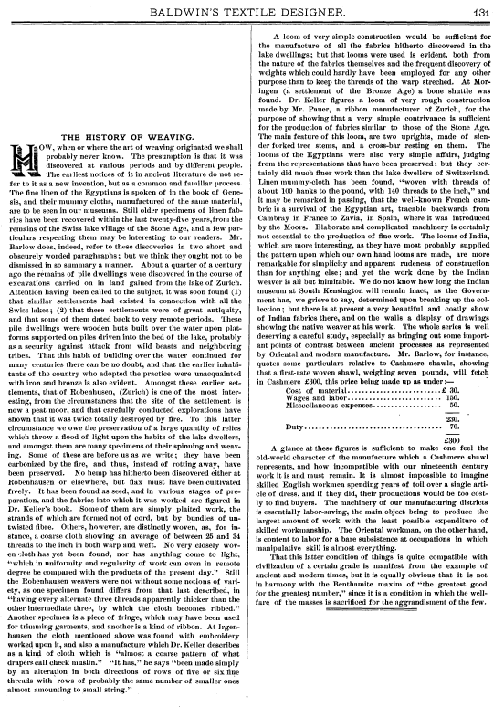 History of Weaving, ---. Baldwin's Textile Designer, Vol. 2, No. 9 (September 1889), 1 page. CD (HWDA09). Posted January 25, 2004. SAMPLE PAGE. File size 544 KB PDF