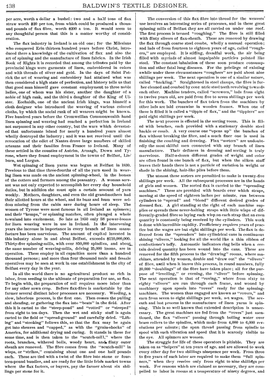 Manufacture of Linen in Ireland, ---. Baldwin's Textile Designer, Vol. 2, No. 9 (September 1889), 3 pages. CD (HWDA09). Posted January 25, 2004. SAMPLE PAGE. File size 608 KB PDF