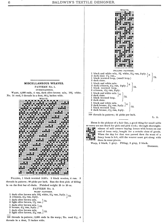 Miscellaneous Weaves, ---. Baldwin's Textile Designer, Vol. 2, No. 3 (March 1889), 2 pages. Note: Ongoing feature. CD (HWDA09). Posted January 25, 2004. SAMPLE PAGE. File size 520 KB PDF