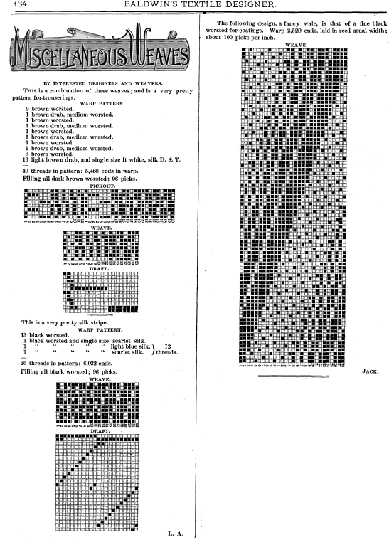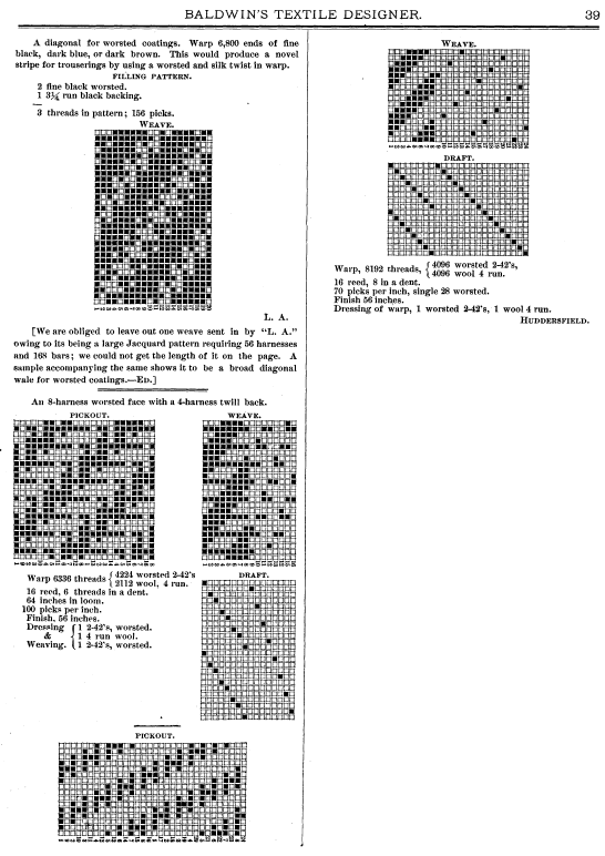 Miscellaneous Weaves, ---. Baldwin's Textile Designer, Vol. 2, No. 3 (March 1889), 2 pages. Note: Ongoing feature. CD (HWDA09). Posted September 9, 2003. SAMPLE PAGE. File size 676 KB PDF