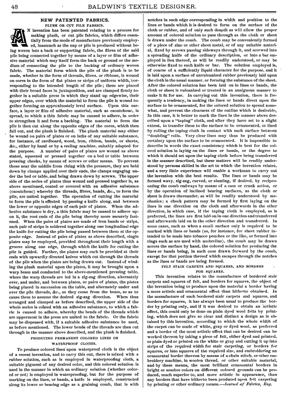 New Patented Fabrics, ---. Baldwin's Textile Designer, Vol. 2, No. 3 (March 1889), 1 page. CD (HWDA09). Posted January 25, 2004. SAMPLE PAGE. File size 572 KB PDF