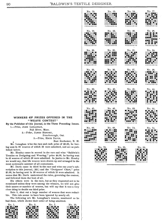 Winners of Prizes Offered in the "Weave Contest", ---. Baldwin's Textile Designer, Vol. 1, No. 9 (September 1888), 1 page. CD (HWDA09). Posted September 23, 2003. SAMPLE PAGE. File size 480 KB PDF