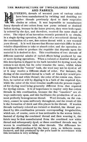 Manufacture of Two-Colored Yarns and Fabrics, ---. Baldwin's Textile Designer, Vol. 2, No. 1 (January 1889), 1 page. CD (HWDA09). Posted January 25, 2004. SAMPLE PAGE. File size 444 KB PDF