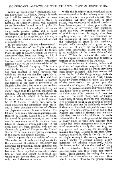 Significant Aspects of the Atlanta Cotton Exposition, ---. Century, Vol. 23, No. 4 (February 1882), 12 pages. CD (HWDA11). Posted October 6, 2004. SAMPLE PAGE. File size 6.1 MB PDF
