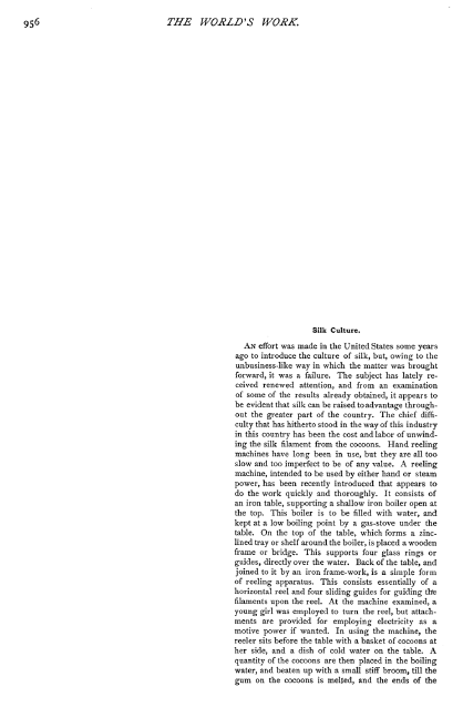 Silk Culture, ---. Century, Vol. 23, No. 6 (April 1882), 2 pages. CD (HWDA11). Posted October 6, 2004. SAMPLE PAGE. File size 840 KB PDF