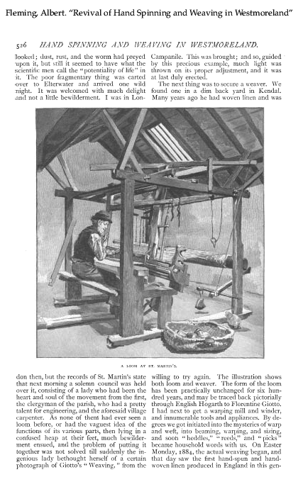 Revival of Hand Spinning and Weaving in Westmoreland, Fleming, Albert. The Century Illustrated Monthly Magazine , Vol. 37, No. 4 (February 1889), 7 pages. Posted October 28, 2001. SAMPLE PAGE. File size 4 MB PDF