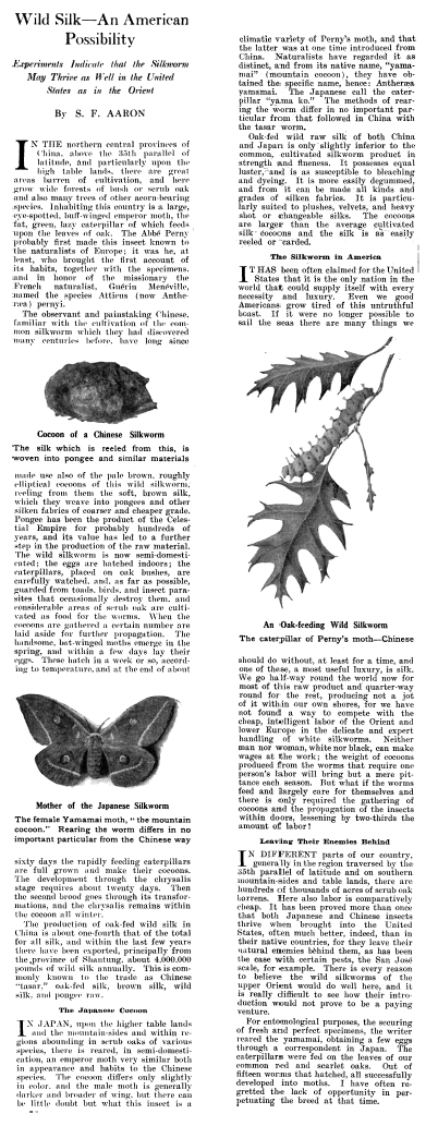 Wild Silk -- An American Possibility, Aaron, S. F. Collier's, Vol. 44 (1909), 1 page.