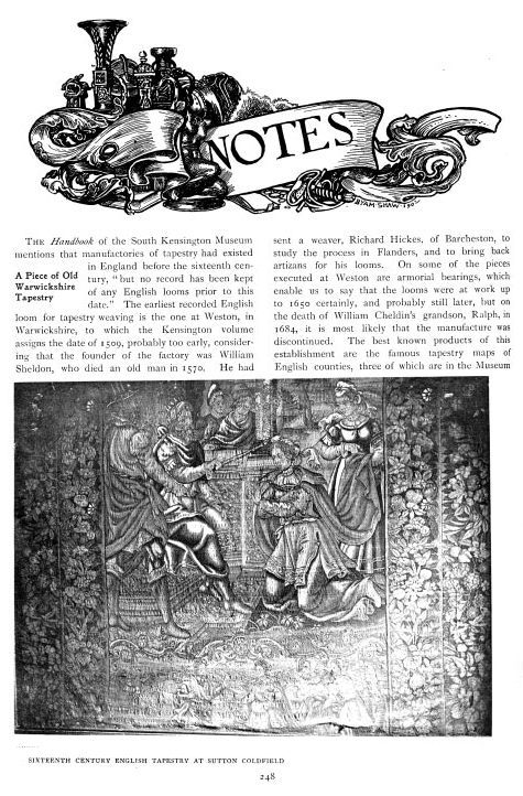 Piece of Old Warwick Tapestry, ---. The Connoisseur, Vol. 7 (1903), 2 pages. CD (HWDA09). Posted May 16, 2003. SAMPLE PAGE. File size 652 KB PDF