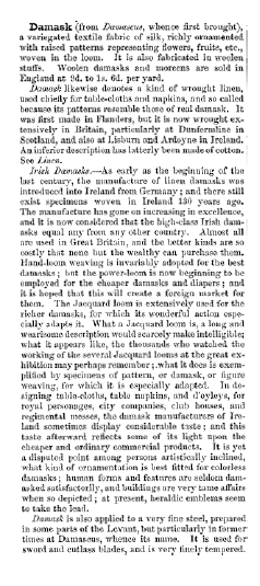 Damask, ---. Cyclopedia of Commerce and Commercial Navigation, 1859, 1 page. Posted December 20, 2004. SAMPLE PAGE. File size 428 KB PDF