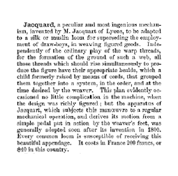 Lace, ---. Cyclopedia of Commerce and Commercial Navigation, 1859, 4 pages. Posted December 20, 2004. SAMPLE PAGE. File size 640 KB PDF
