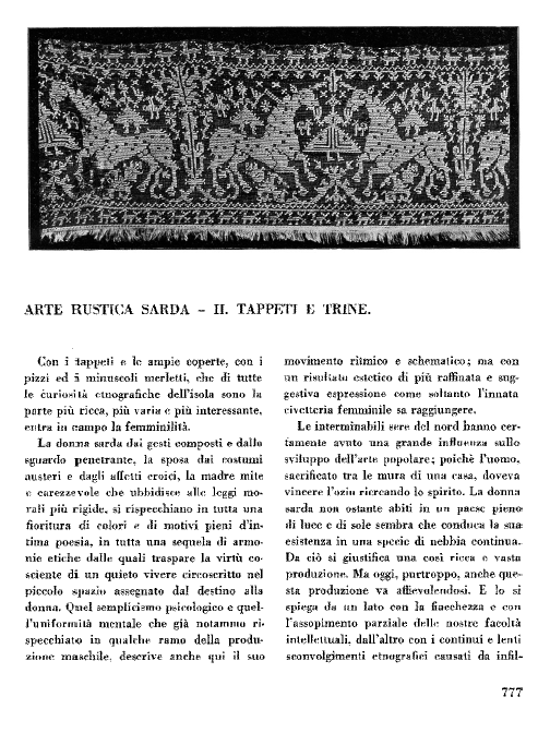 Arte Rustica Sarda -- II. Tappeti e Trine, Arata. Giukio U. Dedalo, Year 1, Volume 2 (1921), 25 pages. Posted May 10, 2005. SAMPLE PAGE. Part 1: File size 7.4 MB PDF. Part 2: File size 7.3 MB PDF.