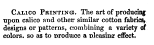 Calico Printing, ---. Dictionary of the Arts, Sciences, and Manfactures, 1853, 1 page. Posted February 16, 2004. SAMPLE PAGE. File size 396 KB PDF