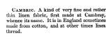 Cambric, ---. Dictionary of the Arts, Sciences, and Manfactures, 1853, 1 page. Posted February 16, 2004. SAMPLE PAGE. File size 396 KB PDF