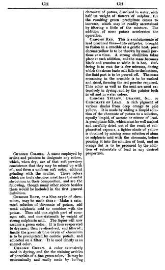 Chrome Colors, ---. Dictionary of the Arts, Sciences, and Manfactures, 1853, 1 page. Posted February 16, 2004. SAMPLE PAGE. File size 452 KB PDF