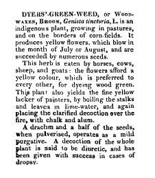 Dyers' Weed, ---. Domestic Encyclopedia, 1821, 2 pages. Posted February 16, 2004. SAMPLE PAGE. File size 512 KB PDF