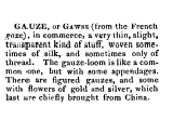 Gauze, ---. Domestic Encyclopedia, 1821, 1 page. Posted February 16, 2004. SAMPLE PAGE. File size 400 KB PDF