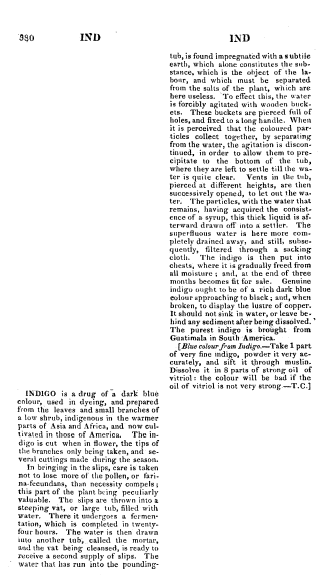 Indigo, ---. Domestic Encyclopedia, 1821, 1 page. Posted February 16, 2004. SAMPLE PAGE. File size 448 KB PDF