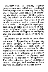 Mordants, ---. Domestic Encyclopedia, 1821, 1 page. Posted February 16, 2004. SAMPLE PAGE. File size 412 KB PDF